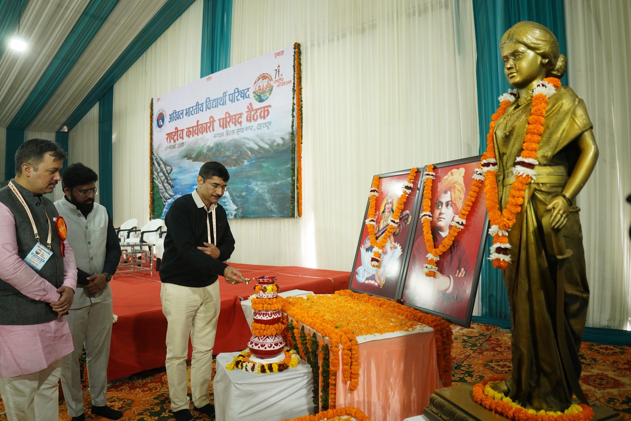 देहरादून । अखिल भारतीय विद्यार्थी परिषद के 71 वें राष्ट्रीय अधिवेशन के पूर्व राष्ट्रीय कार्यकारी परिषद बैठक का शुभारंभ किया गया। बैठक का आयोजन देहरादून में अस्थाई रूप से बसाए गए भगवान बिरसा मुंडा नगर में किया गया, जिसमें अभाविप के राष्ट्रीय अध्यक्ष प्रा. राजशरण शाही, राष्ट्रीय महामंत्री डा. वीरेंद्र सिंह सोलंकी एवं राष्ट्रीय संगठन मंत्री आशीष चौहान ने मां सरस्वती, स्वामी विवेकानंद एवं महारानी अब्बक्का की प्रतिमा पर पुष्प अर्पित कर किया। बैठक में देशभर से आए प्रतिनिधियों ने एक साथ सामूहिक वंदे मातरम का गान भी किया।